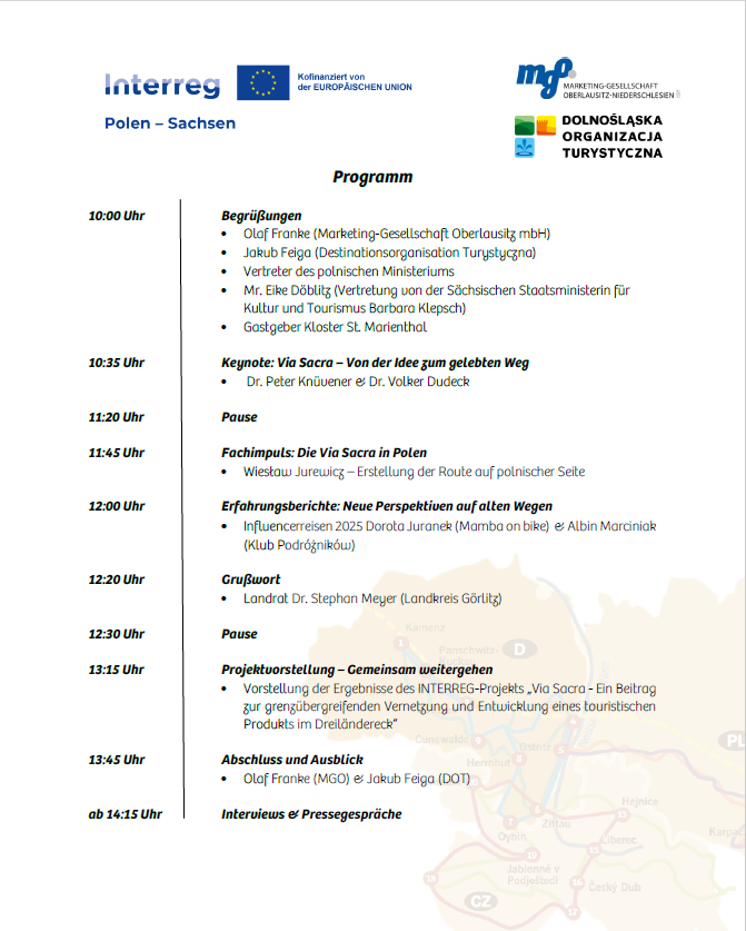 „Als Pilger auf der Via Sacra begibt man sich entlang religiöser Stätten und durch eine einzigartige Naturvielfalt auf eine Reise durch die Jahrhunderte. Der Besuch dieser Orte der Stille und des Glaubens ermöglicht es, nicht nur die Geschichte zu erleben, sondern fördert auch Achtsamkeit und das Bewusstsein für das eigene Empfinden, sodass eine Auszeit vom Alltag im Hier und Jetzt möglich wird.“ – so beschreiben die Partner das Projekt.