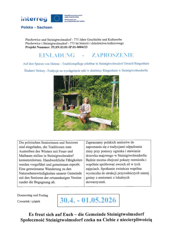 Gmina Piechowice wraz z partnerską gminą Steinigtwolmsdorf zapraszają serdecznie polskich i niemieckich seniorów na interesujące wydarzenie! Poznajcie Państwo tradycje odpędzania zimy przy pomocy ogniska i stawiania drzewka majowego w Steinigtwolmsdorf!