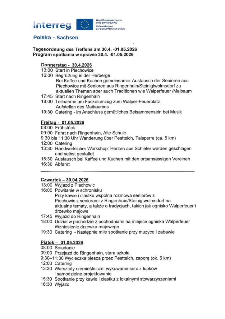 W programie także pokazy rzemiosła i dla zainteresowanych: wspólne warsztaty rzemieślnicze. Na zakończenie spotkania odbędzie się wspólna wycieczka do atrakcji przyrodniczych gminy Steinigtwolmsdorf w towarzystwie seniorów z lokalnych stowarzyszeń.