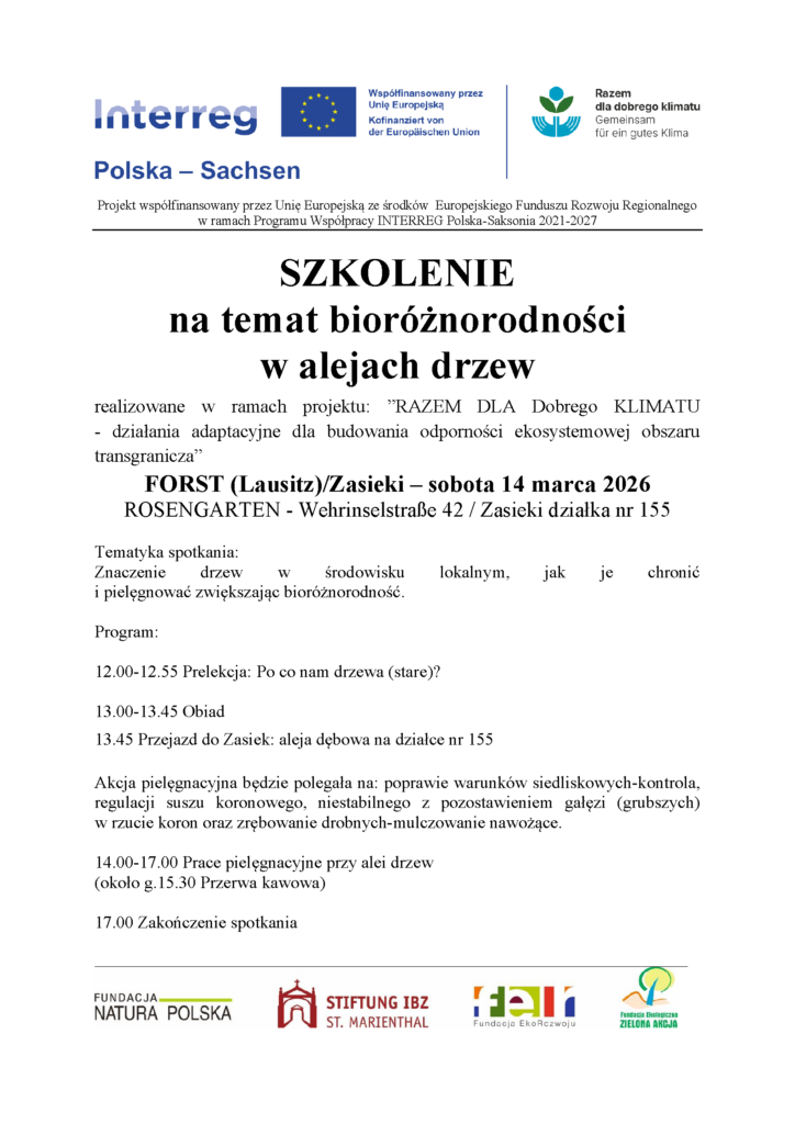 W ramach projektu Interreg Polska – Saksonia 2021-2027 pt. „Razem dla dobrego klimatu – działania adaptacyjne dla budowania odporności ekosystemowej obszaru transgranicza” w dniu 14 marca 2026 r. odbędzie się szkolenie na temat bioróżnorodności w alejach drzew.